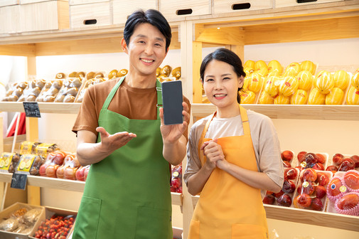 요청 이미지: 소상공인의 경기전망이 지속적으로 개선되며 '위드 코로나' 이후 최고치를 보이고 있는 바, 모바일 카드결제나 지역화폐 등을 능숙하게 이용하는 중소 자영업자의 긍정적 이미지 연출. 방문객 등으로 활기가 도는 전통시장, 청년소상공인의 이미지.